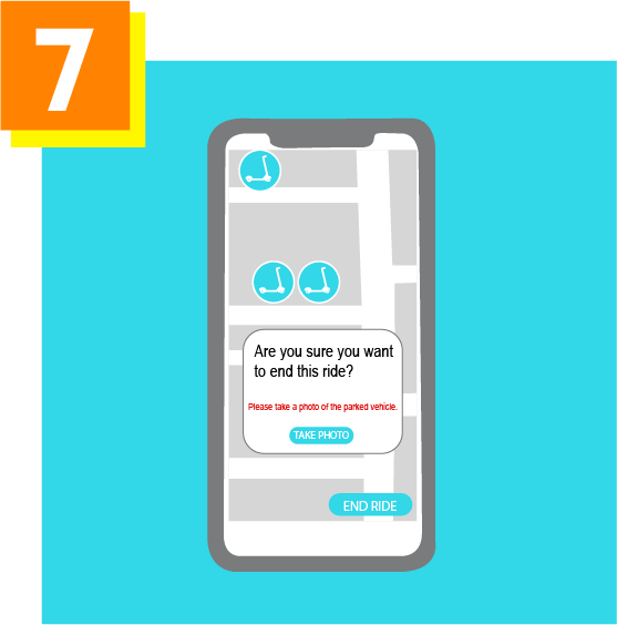 Using your mobile device, please select “END RIDE.” You will be prompted to take a photo of the parked vehicle.